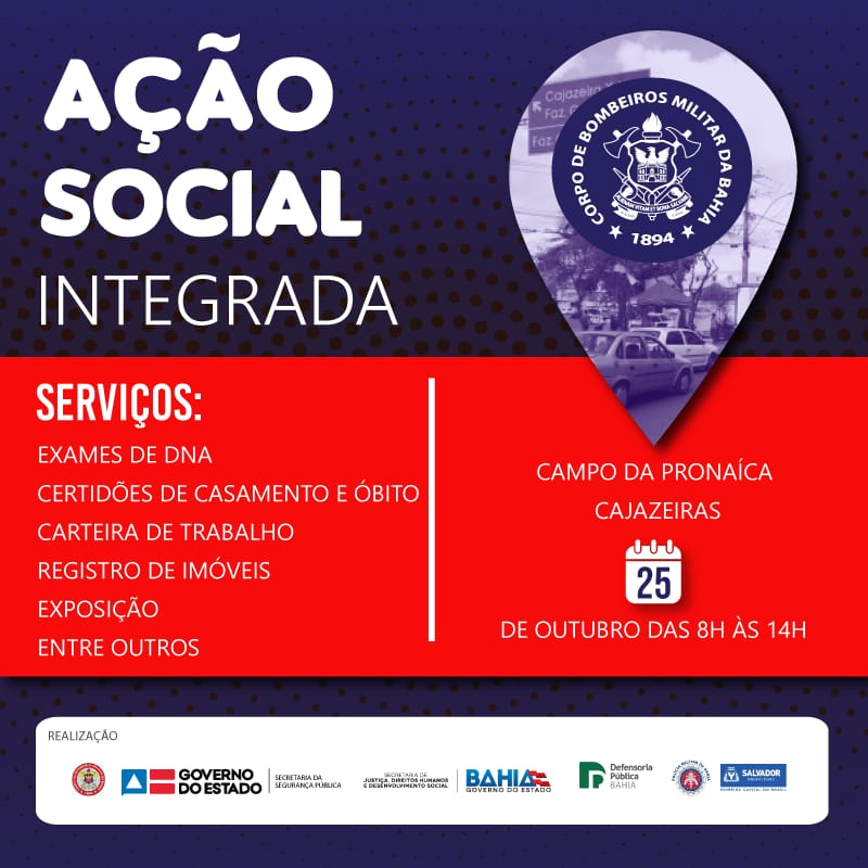 Exames de DNA, certidões de casamento e óbito, carteira de trabalho, registro de imóveis, além de exposição de equipamentos utilizados no dia a dia dos bombeiros militares, serão apenas alguns dos serviços oferecidos durante a Ação Social Iintegrada que acontece nesta sexta-feira (25), no Campo da Pronaíca, em Cajazeiras, das 8h às 14h.