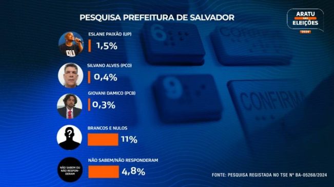 O levantamento foi realizado entre os dias 29 de agosto e 1º de setembro, com 800 eleitores entrevistados em Salvador. A margem de erro é de 3,5 pontos percentuais, para mais ou para menos, e o índice de confiança é de 95%. A pesquisa está registrada no Tribunal Superior Eleitoral (TSE) sob o número BA-05268/2024.