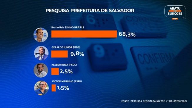 Uma nova pesquisa de intenções de voto realizada pelo instituto Paraná Pesquisas, encomendada pela Aratu, em parceria com a rádio Antena 1 e o site Bahia Notícias, aponta para a reeleição do atual prefeito de Salvador, Bruno Reis (União), no primeiro turno das eleições de 2024. O levantamento mostra que Bruno Reis lidera com 68,3% das intenções de voto na pesquisa estimulada, quando os nomes dos candidatos são apresentados aos eleitores.