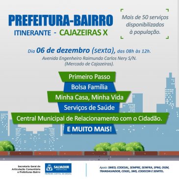 O projeto da Prefeitura-Bairro Itinerante irá ser realizado nesta sexta-feira (6). Mais de 50 serviços gratuitos serão disponibilizados à população, no Mercado Municipal de Cajazeiras, das 8h às 12h.