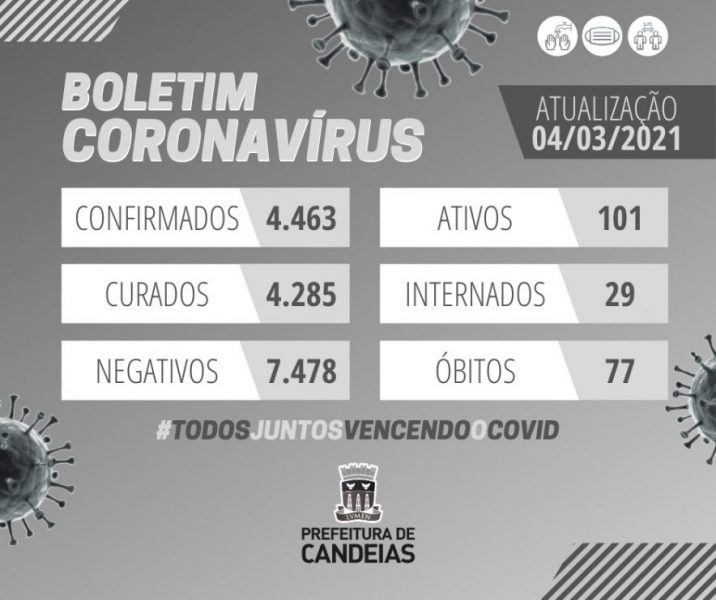 O Boletim Diário com os dados sobre a pandemia do coronavírus em Candeias informa 4.463 casos confirmados de pessoas com Covid-19, desde o começo da pandemia. Desses casos, 4.285 pessoas estão curadas; 101 casos estão ativos, com 29 pacientes em isolamento hospitalar. Um óbito que ocorreu durante a semana foi confirmado pela doença. Ao todo, são 77 vidas perdidas no município. O boletim epidemiológico contabiliza 7.478 casos descartados após resultado negativo de teste molecular RT-PCR (LACEN-BA) e de testes rápidos para detecção de anticorpos.