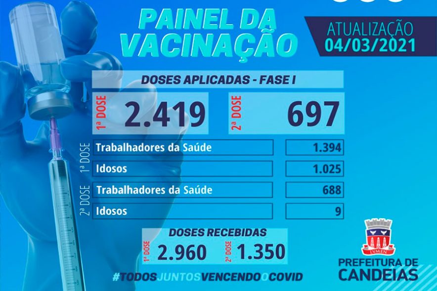 O Painel da Vacinação registrou nesta quinta-feira (4/3), 3.116 doses aplicadas no município. São 2.419 profissionais de saúde e idosos vacinados, dentre os quais, 697 já receberam a segunda dose de imunizante. As informações estão registradas no sistema de campanha do Programa Nacional de Imunizações.