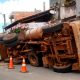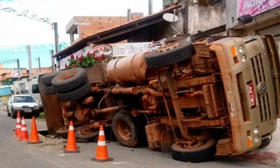 Uma caçamba tombou, na manhã desta quarta-feira (18), no bairro de Valéria, em Salvador, depois que parte do asfalto cedeu. As rodas traseiras do veículo ficaram...