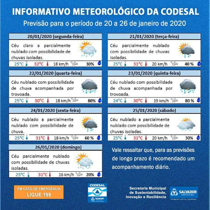 Segundo a Codesal, o sistema de baixa pressão que atuou sobre os estados de MG e ES, ocasionou chuvas intensas. Esse mesmo sistema está atuando em Salvador ocasionando chuvas fracas a moderadas, por vezes fortes, acompanhada por trovoadas e rajadas de ventos, devido ao calor e a umidade provenientes do oceano Atlântico.