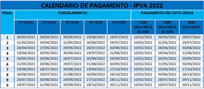 Os donos de automóveis de placas com finais 1, 2, 3 e 4 possuem prazos terminando em abril para o pagamento do Imposto sobre Propriedade de Veículos Automotores (IPVA). Os proprietários de veículos com placas de finais 3 e 4 podem quitar o imposto em cota única com 10% de desconto até os dias 28 e 29/04, respectivamente. Outra opção é pagar a primeira das cinco cotas do IPVA, sem desconto. Já os contribuintes que possuem automóveis com placas 1 e 2 que dividiram o tributo em cinco vezes precisam quitar a segunda cota até 28 e 29 de abril, respectivamente.