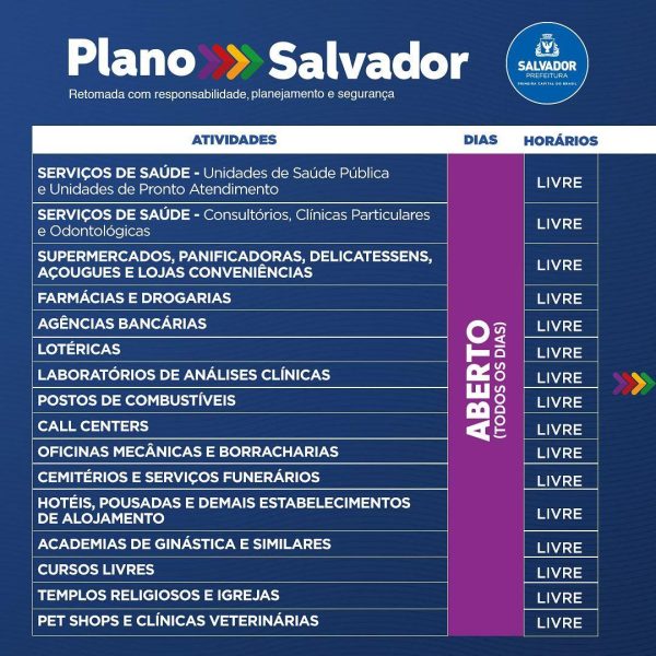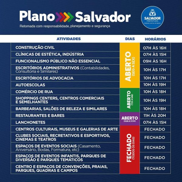 Fases – São quatro as fases do plano de retomada. A roxa, que é a qual Salvador está atualmente, possui apenas atividades essenciais abertas. A vermelha, a ser iniciada a partir de segunda (5), prevê a retomada dos serviços não essenciais de forma escalonada, suspensão de alguns setores por pelo menos dois dias da semana e alteração do horário do toque de recolher, que sairá de 18h às 5h para 20h às 5h.