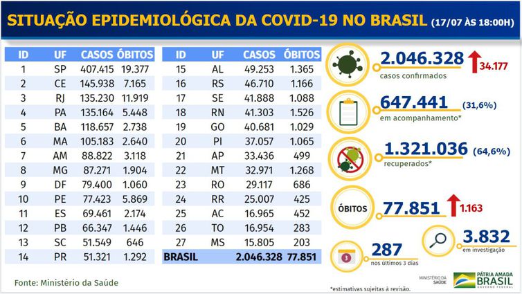 Os estados com mais mortes por covid-19 são: São Paulo (19.377), Rio de Janeiro (11.919), Ceará (7.165), Pernambuco (5.869) e Pará (5.448). As Unidades da Federação com menos falecimentos pela pandemia são: Mato Grosso do Sul (203), Tocantins (283), Roraima (425), Acre (452) e Amapá (499).