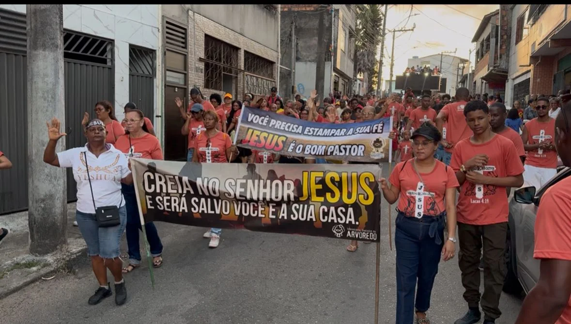 A programação teve início no período da tarde com uma caminhada pelas ruas do bairro. O percurso começou em um posto de combustíveis da região e seguiu até o final de linha, atraindo a atenção de quem acompanhava o movimento e transformando o trajeto em um espaço de oração e louvor coletivo.