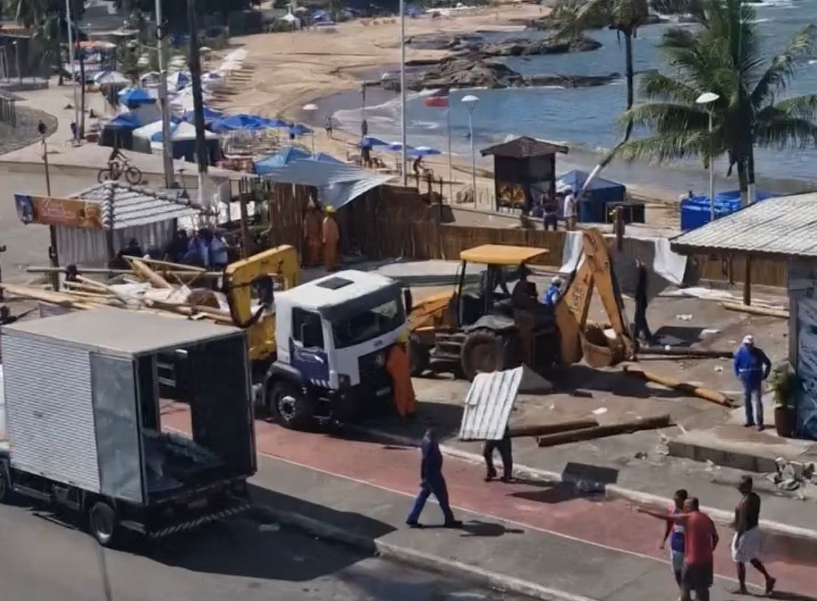 Na manhã desta terça-feira (8), equipes de fiscalização da Prefeitura iniciaram a demolição de estruturas de quiosques localizadas na orla de Itapuã, em Salvador. A ação gerou protestos por parte dos trabalhadores que atuavam no local.