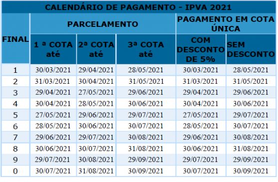 Os débitos referentes à taxa de licenciamento e às multas de trânsito deverão ser pagos até a data de vencimento da terceira parcela. Os débitos anteriores do IPVA ainda não notificados também podem ser divididos em três vezes, juntamente com o IPVA 2021. No entanto, o proprietário que perder o prazo da primeira cota deixa de ter o direito ao parcelamento. O pagamento do tributo referente a embarcações e aeronaves deverá ser efetuado até 1º de junho de 2021.