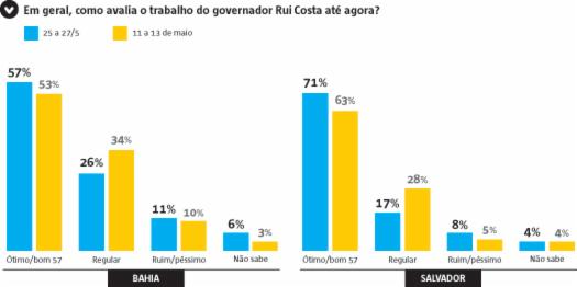 A pesquisa também aponta a disparidade no desempenho do governador na Região Metropolitana de Salvador (RMS) e no resto do estado. Na RMS, seu governo é ótimo e bom para 72% da população. Já no interior, o percentual cai para 52%. Não há dados estratificados sobre perfil dos entrevistados em Salvador.