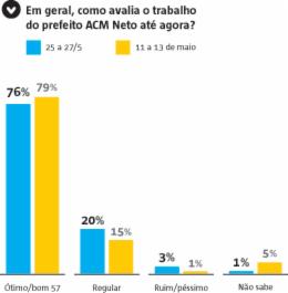 O prefeito ACM Neto teve oscilação negativa na avaliação entre as duas pesquisas, mas ela ainda permanece acima da média baiana. Ela caiu de 79% para 76% de ótimo e bom, enquanto o trabalho dos prefeitos é visto da mesma forma por 47% da população do estado. Regular saiu dos anteriores 15% para 20%; ruim e péssimo, de 1% para 3%. Não sabem ou não opinaram eram 1%. Agora, são 5%.