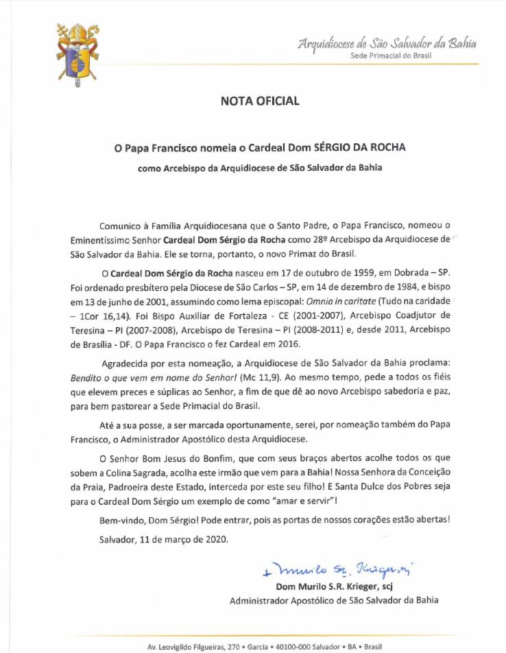 Após pedido de renúncia de Dom Murilo Krieger, o Papa Francisco anunciou na manhã desta quarta-feira, 11, o nome Cardeal Dom Sergio da Rocha como o novo Arcebispo de Salvador e Primaz do Brasil. Até o dia da posse do religioso, Dom Murilo passa a ser o administrador apostólico da Arquidiocese de Salvador.