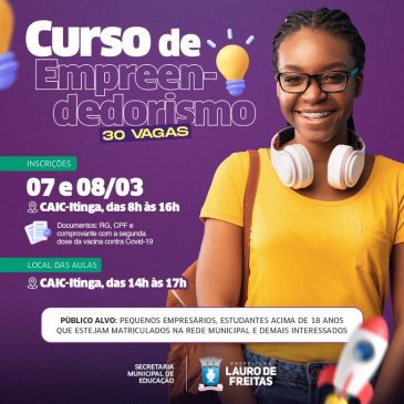 O Departamento Mundo do Trabalho da Secretaria Municipal de Educação (SEMED) abre inscrições, na próxima segunda-feira (7), para o curso gratuito de desenvolvimento de competências em empreendedorismo, em Lauro de Freitas. Ao todo são 30 vagas.
