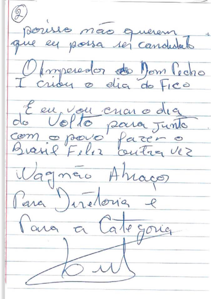 A carta foi direcionada ao presidente do Sindicato dos Metalúrgicos do ABC, Wagner Santana. “O imperador Dom Pedro I criou o Dia do Fico. E eu vou criar o dia do ‘Volto’ para, junto com o povo, fazer o Brasil feliz outra vez”, escreveu o ex-presidente ao amigo.