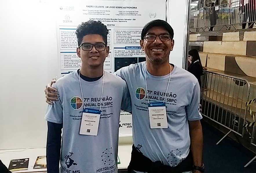 O estudante Maicon Douglas dos Santos, 17, do 3º ano no Colégio Estadual Edvaldo Brandão Correia, localizado em Salvador, conquistou o 1º lugar na área de Ciências Exatas e da Terra, na I Mostra Nacional de Feiras de Ciências, que integrou a programação da 71ª reunião anual da Sociedade Brasileira para o Progresso da Ciência (SBPC), que aconteceu até sábado (27), na Universidade Federal de Mato Grosso do Sul (UFMS), em Campo Grande, no Mato Grosso do Sul (MS). A conquista foi pelo projeto “Razão celeste: um jogo sobre Astronomia”, que alia tecnologia e astronomia.[sg_popup id=”9948″ event=”inherit”][/sg_popup]