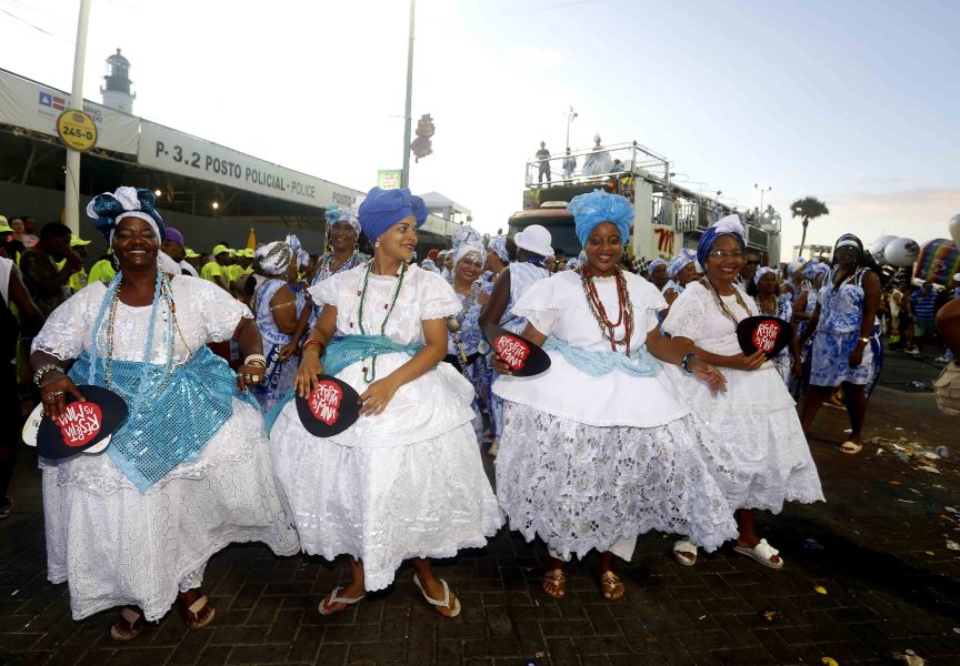 Colocar mortalha, colar, turbante, maquiagem e muita água de cheiro. Esse é o ritual que as participantes do afoxé Filhas de Gandhy realizam antes de sair para curtir o Carnaval. Com 41 anos de existência, o bloco exalta a luta pela defesa e direito das mulheres.