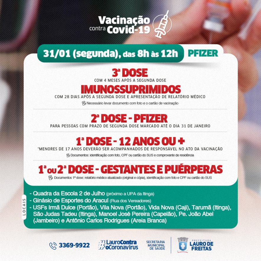 Nesta segunda-feira (31), das 8h às 12h, o público que já tenha tomado a 2° dose de alguma das vacinas contra a Covid-19 há pelo menos quatro meses, e imunossuprimidos há ao menos 28 dias, poderá tomar a dose de reforço em Lauro de Freitas. No mesmo dia também será disponibilizada a 2° dose do imunizante da Pfizer, para pessoas com data marcada até dia 31 de janeiro.