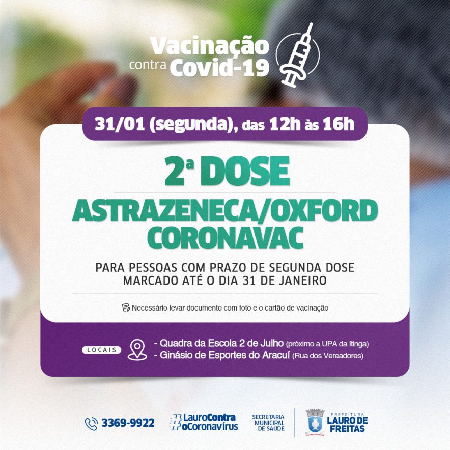 No período da tarde, das 12h às 16h, será a vez do público de 2° dose dos imunizantes da Astrazeneca/Oxford e Coronavac, com prazo marcado até o dia 31 de janeiro. Para este público serão disponibilizados dois locais para vacinação, a quadra do Colégio Dois de Julho e o Ginásio de Esportes do Aracuí.