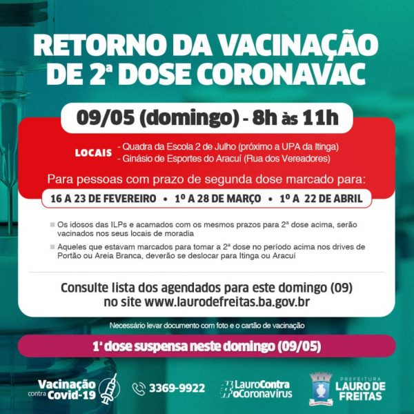 Neste domingo (09), Lauro de Freitas retoma a imunização com a segunda dose da Coronavac, depois de receber, na tarde deste sábado, um pequeno lote de vacinas. Quem estava com prazo marcado na caderneta para receber o reforço nos dias 16 a 23 de fevereiro, 1º a 28 de março e de 1º a 22 de abril deve comparecer aos locais de vacinação: Ginásio de Esportes do Aracuí e Colégio 2 de Julho, na Itinga, das 8h às 11h. Desse público, 487 pessoas deixaram de tomar a 2ª dose e podem comemorar o Dia das Mães completando o ciclo de imunização.