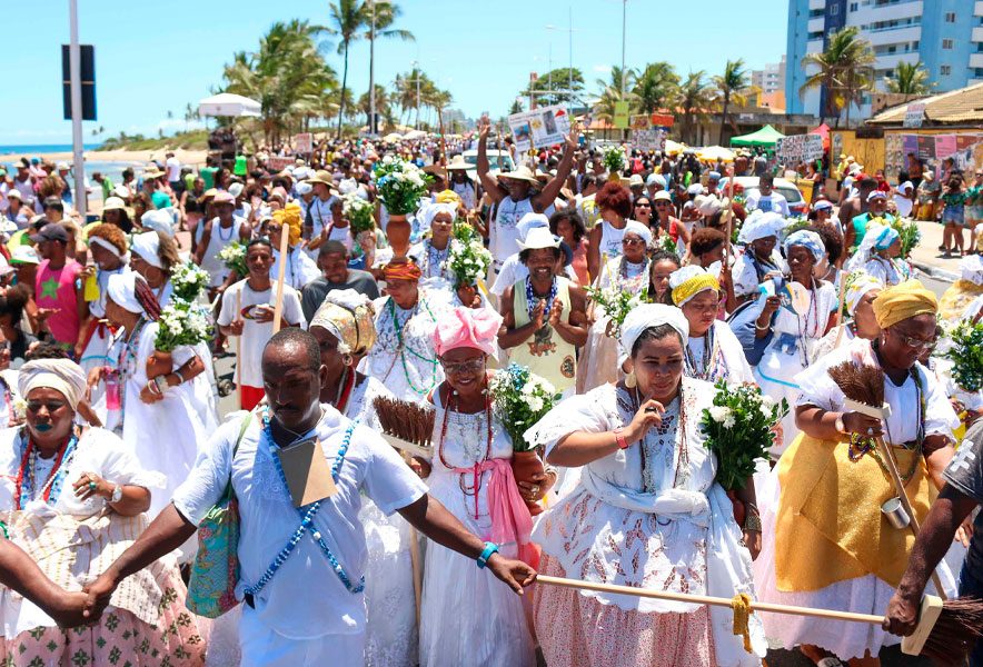 O relógio marcava pouco mais de 12h e a temperatura passava dos 30 graus quando o segundo cortejo das baianas saiu de Piatã, na altura do Atakarejo, rumo à Praça Dorival Caymmi para lavagem das escadarias da Igreja de Nossa Senhora da Conceição de Itapuã. No grupo, Gildete Mendes, 68, levava ebô para Oxalá e flores para Obaluê. “Vim pedir força, progresso e paz”, declarou ela, em ato que marca o sincretismo religioso da festa.