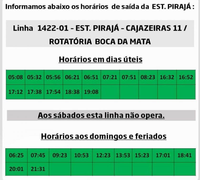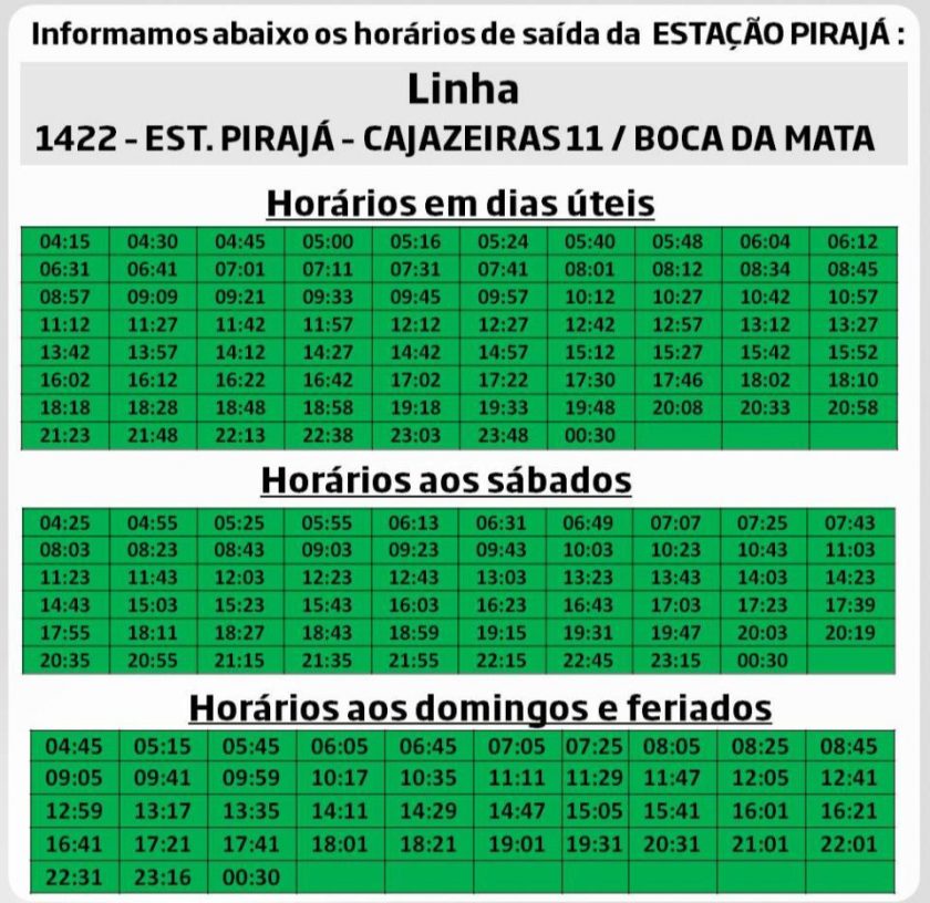 A linha 1422 BOCA DA MATA/CAJ 11 – Estação Pirajá e 142201 CAJ 11/EST PIRAJÁ tiveram aumento de viagens nos dias úteis.