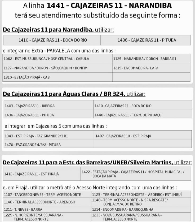 A Linha Narandiba será extinta os usuários terão como opção integrar com outras linhas nos corredores da Paralela, Estação Pirajá ou Mussurunga.