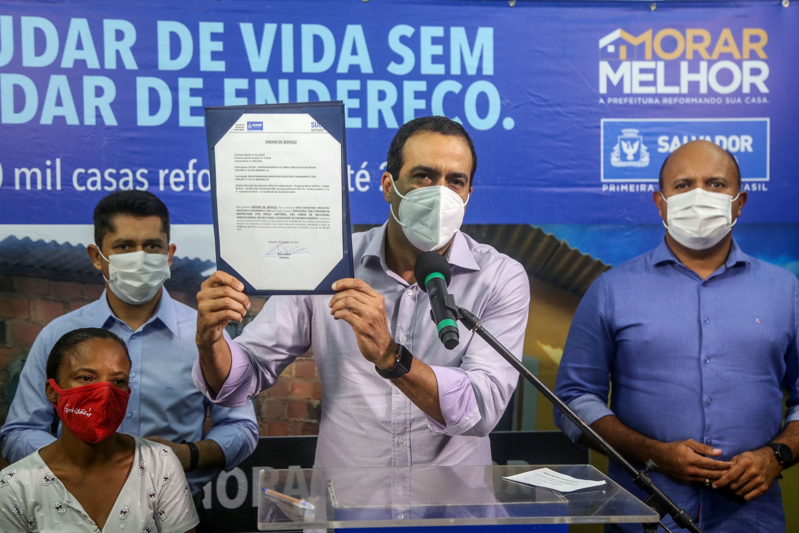 Pela primeira vez, o bairro de Fazenda Grande I, na região de Cajazeiras, recebe a ação de reforma de casas em situação precária, promovidas pela Prefeitura através do Morar Melhor. A ordem de serviço para a intervenção imediata em 201 imóveis na localidade foi assinada pelo prefeito Bruno Reis, ao lado dos secretários Luiz Carlos de Souza (Infraestrutura e Obras Públicas) e Kiki Bispo (Promoção Social), em cerimônia simbólica realizada na noite desta quarta-feira (16), na Rua Gerson Souza.