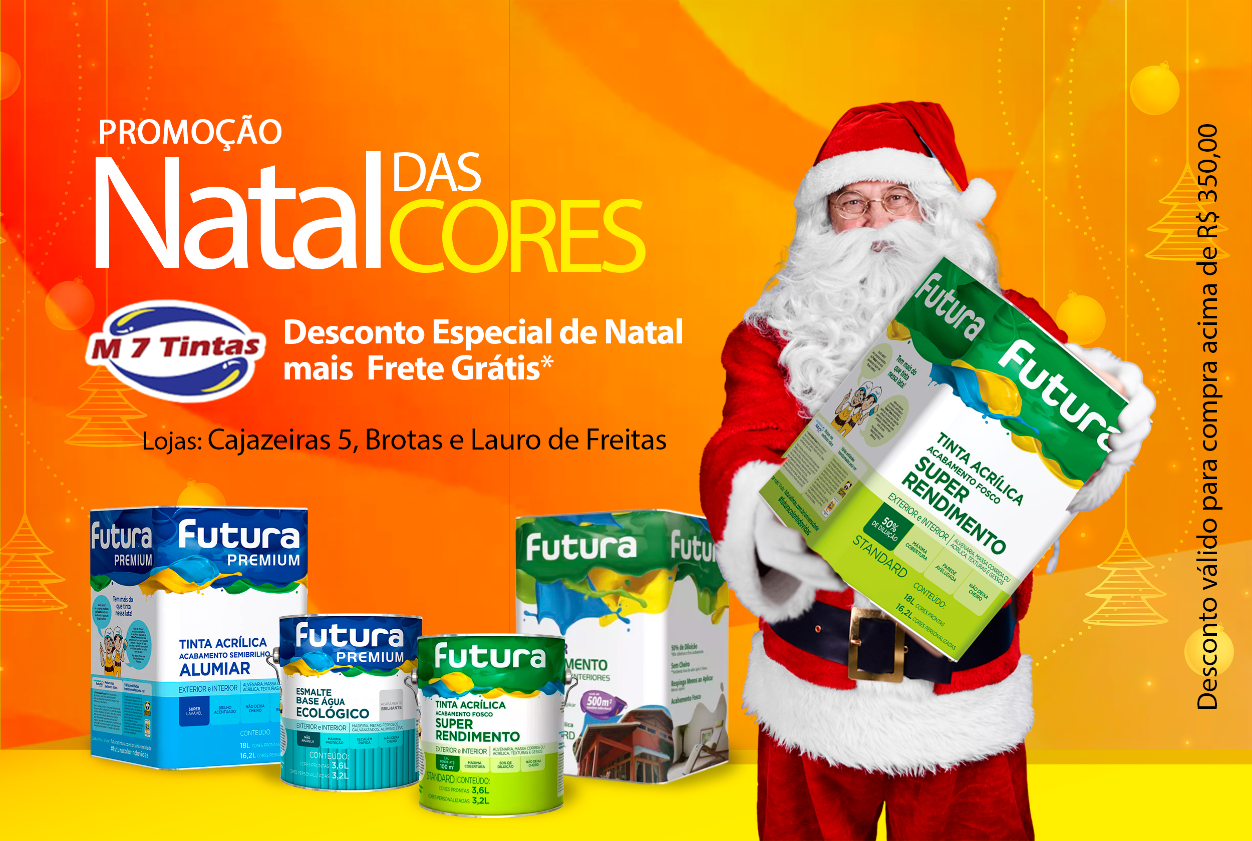 A M7 Tintas entrou no clima das festas de fim de ano com o lançamento da campanha “Natal das Cores”, trazendo condições especiais para quem deseja renovar a casa ou dar um novo visual ao ambiente de trabalho neste mês de dezembro. A loja está oferecendo frete grátis para compras acima de R$ 350,00, além de descontos exclusivos para clientes de Cajazeiras, Salvador e toda a Região Metropolitana.