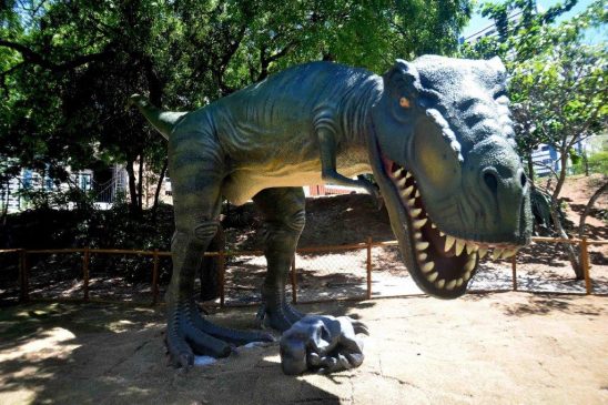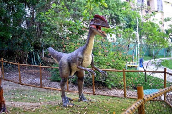 Duas delas são de Tiranossauro Rex, com aproximadamente cinco metros de altura e nove metros de comprimento cada. As demais estão distribuídas em seis réplicas de Velociraptor, duas de Dilofossauro, uma de Dilofossauro Sinensis, uma de Braquiossauro, uma de Pteranodonte e um Anquilossauro.