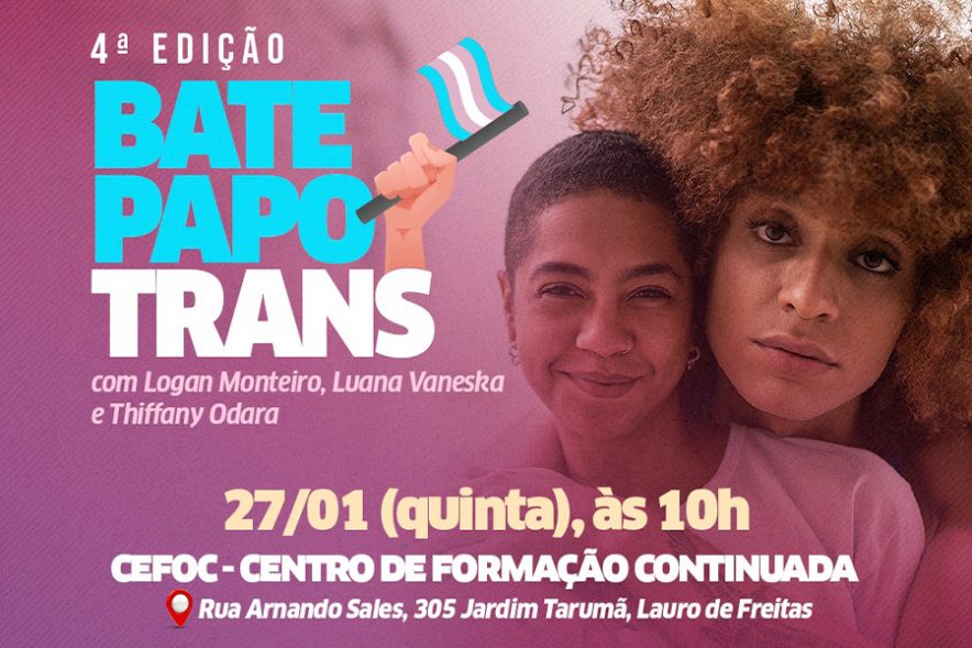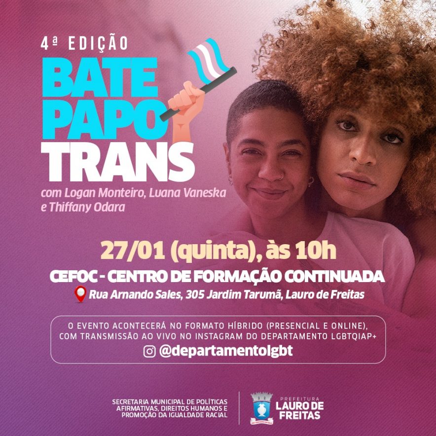 A partir das 10h desta quinta-feira (27), acontece o 4º Bate Papo Trans, uma edição especial realizada neste mês de Janeiro, mês da visibilidade trans. O evento, realizado pela Prefeitura de Lauro de Freitas por meio da Secretaria Municipal de Políticas Afirmativas, Direitos Humanos e Promoção da Igualdade Racial (Sepadhir), contará com a participação de Logan Monteiro, Luana Vaneska e Thiffany Odara. O evento será transmitido no instagram @departamentolgbt.