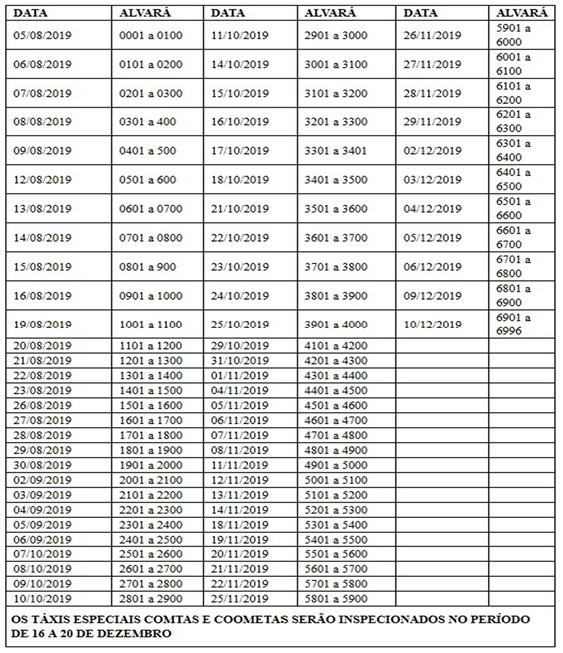 O valor da inspeção é de R$ 81,79, e aquele que não se apresentar na data marcada pagará multa de R$ 32,95. O cumprimento da medida vai até dezembro, seguindo o fluxo do cronograma montado segundo o número do alvará de cada veículo. A expectativa é que sejam vistoriados, por dia, uma média de 100 veículos. O serviço está disponível de segunda à sexta-feira, das 7h30 às 11h30 e das 13h às 16h30.