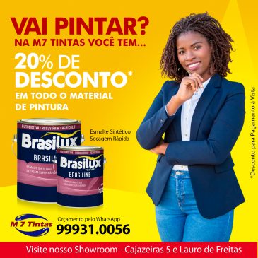 Não deixe passar essa oportunidade única de renovar seus espaços com produtos de alta qualidade a preços imbatíveis. Visite a M7 Tintas em Cajazeiras 5 ou entre em contato pelo WhatsApp para aproveitar o desconto de 20% em todo o material de pintura. Transforme sua casa ou empresa com a M7 Tintas, onde qualidade e economia se encontram!