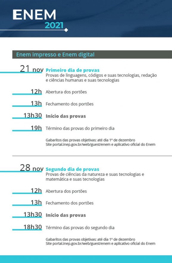 O Enem será aplicado nos dias 21 e 28 de novembro para mais de 3 milhões de estudantes em todo o país, tanto na versão impressa quanto na versão digital. No primeiro dia de prova, os participantes farão as provas de linguagens, ciências humanas e redação. No segundo, matemática e ciências da natureza. Os locais de prova estão disponíveis no Cartão de Confirmação de Inscrição na Página do Participante.