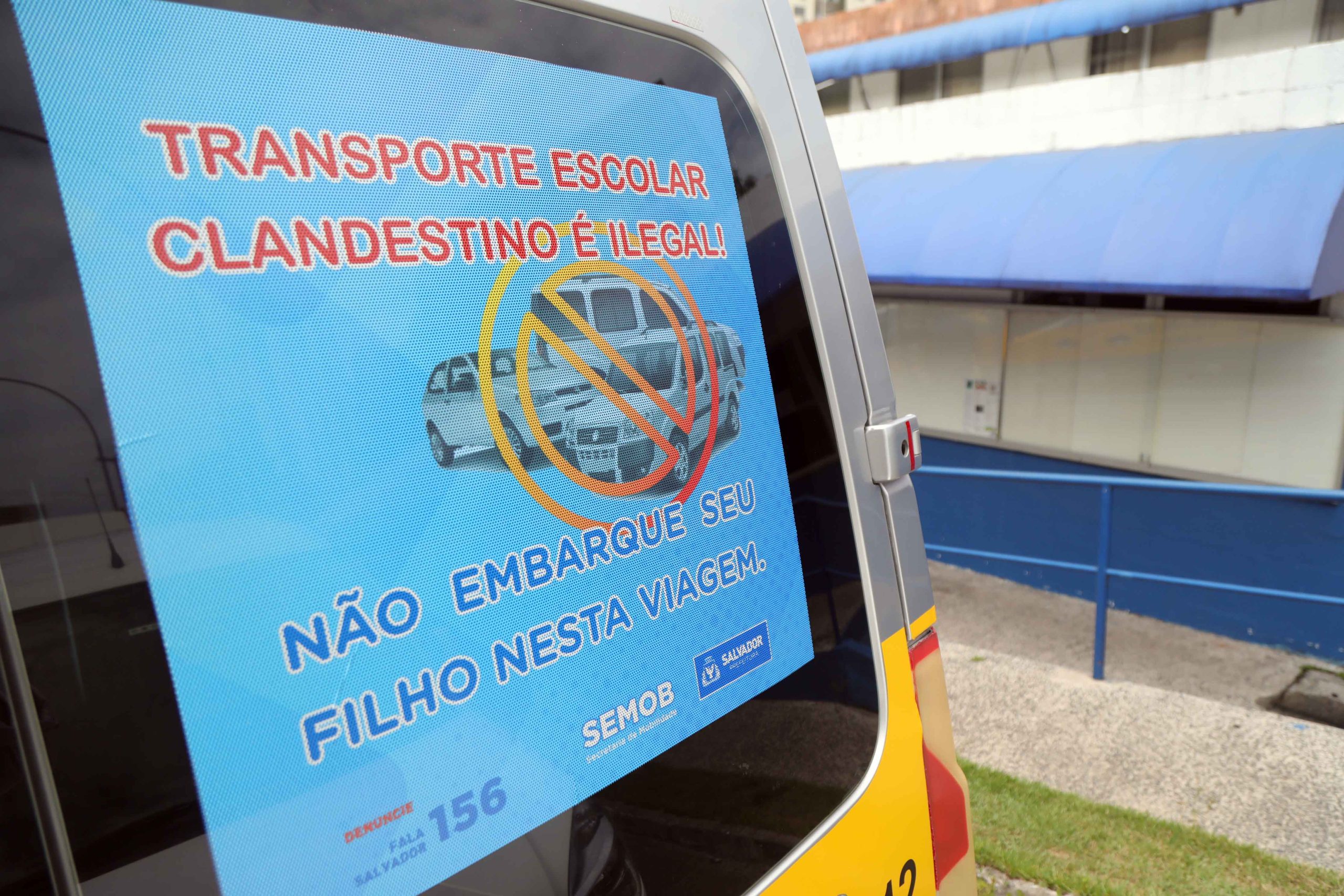 Com o intuito de coibir o transporte escolar clandestino em Salvador e reforçar a segurança das crianças, a Secretaria de Mobilidade (Semob) lançou a campanha “Não Embarque Seu Filho Nesta Viagem”, na manhã desta sexta-feira (26). A ação consiste na plotagem de adesivos perfurados nos veículos de transporte escolar para orientar os pais sobre a importância de contratar esse serviço regulamentado e os riscos de entregar as crianças para um transportador clandestino ou não credenciado pela Prefeitura.