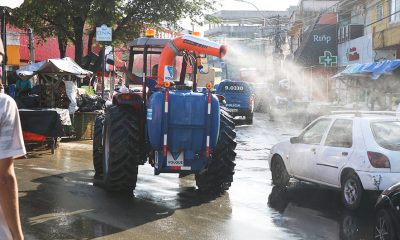 Para auxiliar no processo de limpeza e higienização na região da Rótula da Feirinha, além dos agentes de limpeza um trator que dispõe de um jato...