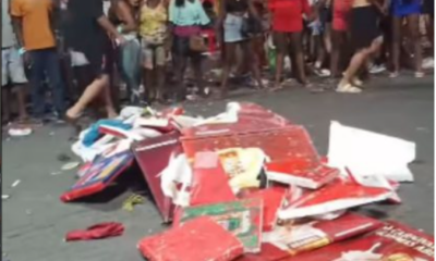 No primeiro dia do Carnaval de Salvador, trabalhadores ambulantes fizeram uma manifestação nas proximidades do Farol da Barra após equipamentos usados no trabalho, como isopores, terem...