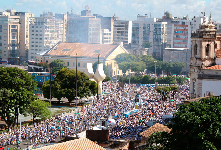 Demonstrações de fé – Perto do Elevador Lacerda, a carioca Fátima Martins, 55,  estava acompanhada do marido e dos filhos. A economista recordou que é o décimo ano que participa da lavagem e que hoje ia tentar fazer o percurso de aproximadamente 8km até a Basílica Santuário da Nosso Senhor do Bonfim. “Fiz vários pedidos ao Senhor do Bonfim. Para todas as áreas da minha vida. Pretendo chegar até a Colina e pegar a fitinha lá, inclusive”, afirmou.