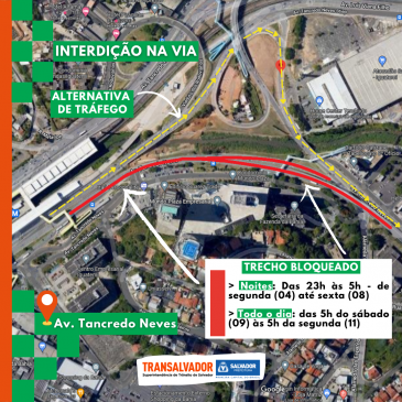 Interdição noturna – Entre os dias 4 (segunda-feira) e 8 de abril (sexta-feira), o trânsito em parte da Avenida Tancredo Neves, no sentido orla, será interditado das 23h às 5h. O bloqueio acontece no trecho entre a passarela em frente ao Centro Empresarial Iguatemi e o Viaduto Mamede Paes Mendonça (em frente ao Jornal A Tarde). A interdição é necessária para a realização do serviço de nivelamento da pista atual e da nova ponte sobre o Rio Camarajipe (duplicação da LIP).