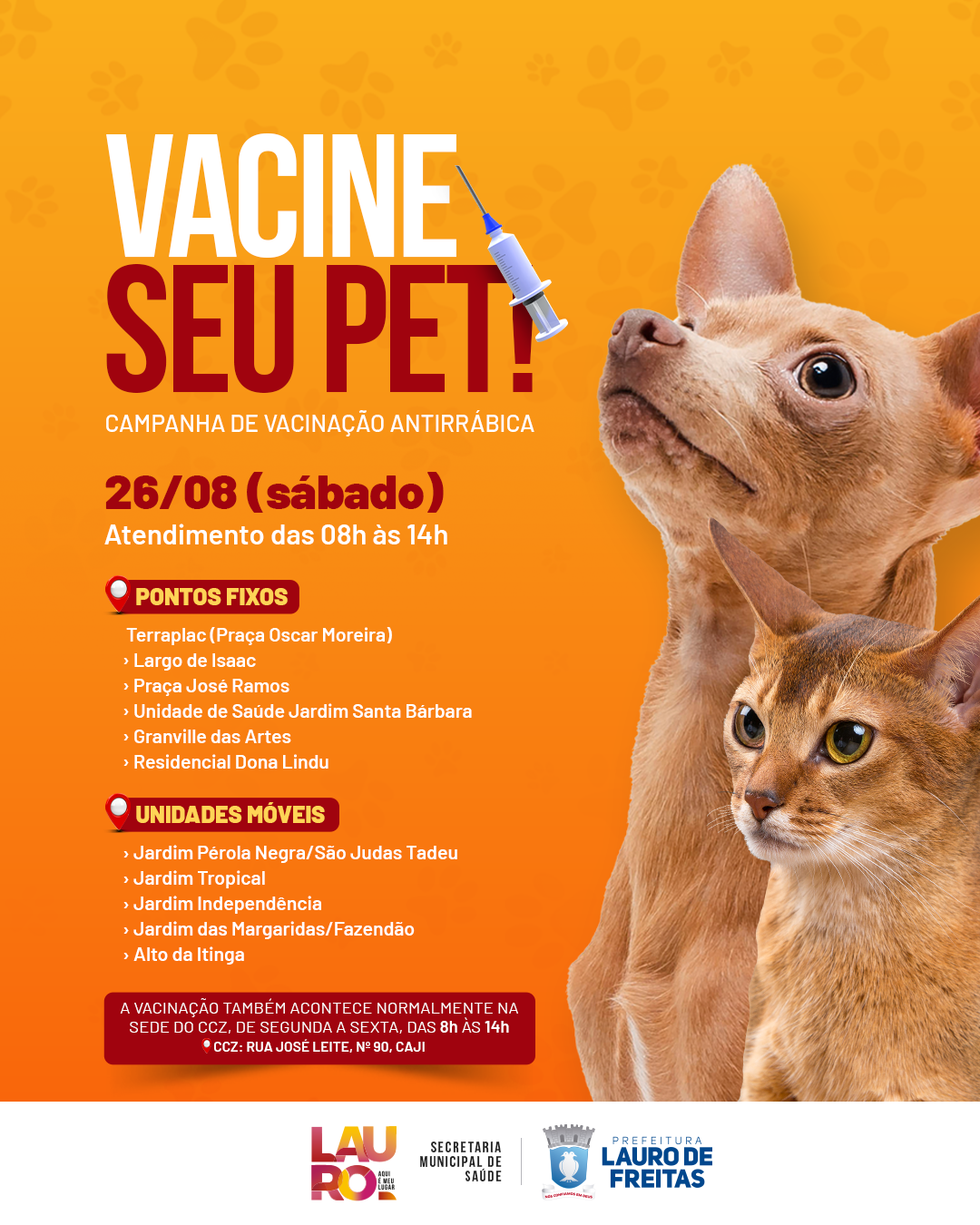 Vale ressaltar que a vacinação ocorre normalmente na sede do CCZ, localizada na Rua José Leite, no bairro do Caji, de segunda a sexta-feira, das 8h às 14h. Donos de cães ou gatos que desejem outras informações sobre a campanha podem tirar dúvidas através do contato do CCZ de Lauro de Freitas: (71) 3369-9919.